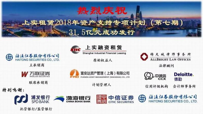 最后,特別鳴謝浦發(fā)銀行、渤海銀行、中信證券、中國銀行及江蘇銀行等投資者的大力支持、感謝各位投資者對上實租賃的信任,同時向海通證券等承銷機構(gòu)致以誠摯謝意。上實租賃將秉承“不忘初心”的宗旨,在資產(chǎn)證券化領(lǐng)域“砥礪前行”。