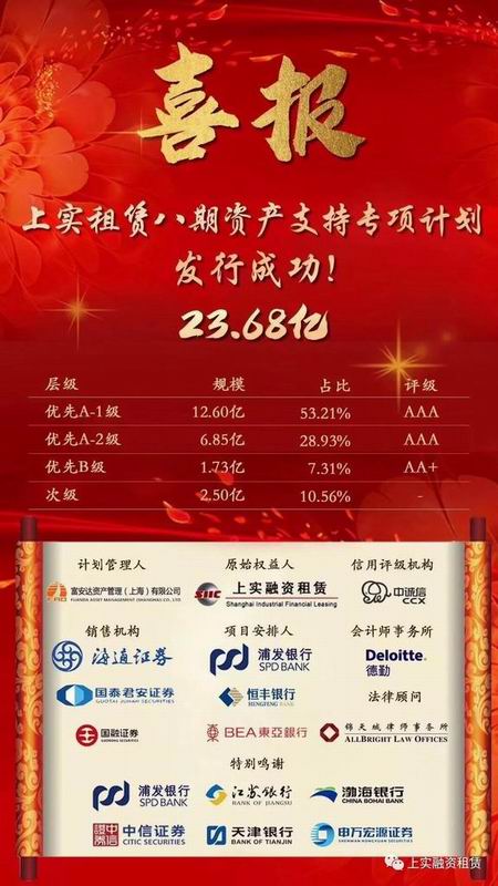 由上實(shí)融資租賃有限公司發(fā)行的“上實(shí)租賃八期資產(chǎn)支持專項(xiàng)計劃”于2019年7月17日成功設(shè)立,發(fā)行規(guī)模23.68億。牽頭銷售機(jī)構(gòu)海通證券、國君證券,聯(lián)席銷售機(jī)構(gòu)國融證券,項(xiàng)目安排人浦發(fā)銀行、恒豐銀行、東亞銀行。截至目前,上實(shí)租賃已發(fā)行八期ABS產(chǎn)品,總計發(fā)行金額為146.93億元。通過多次發(fā)行逐步建立了一套以“專業(yè)化的風(fēng)控流程”為核心、“標(biāo)準(zhǔn)化的承做流程”和“職業(yè)化的管理流程”為兩翼的資產(chǎn)證券化發(fā)行體系。