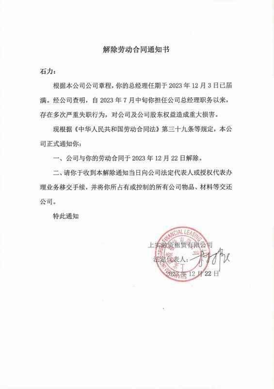 關(guān)于解除石力勞動關(guān)系的公告