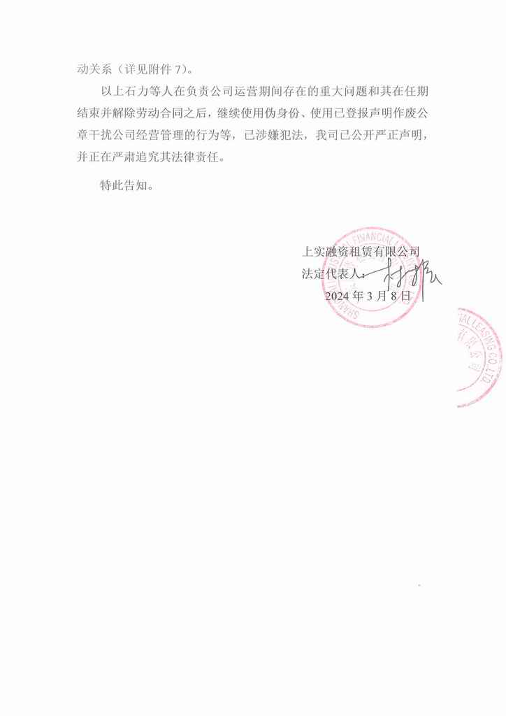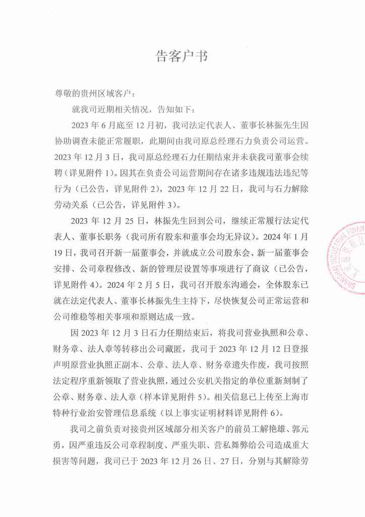 因我司原總經(jīng)理石力在其任期結(jié)束并已被解除勞動關(guān)系后,繼續(xù)使用偽身份、使用我司已登報(bào)聲明作廢公章向客戶發(fā)函混淆視聽,干擾公司正常經(jīng)營管理,導(dǎo)致我司貴州區(qū)域的部分客戶以此為由,拒絕向我司償付已逾期租金,已經(jīng)對我司正常運(yùn)營造成了不利影響。故我司在已多次溝通解釋的基礎(chǔ)上,向貴州區(qū)域客戶發(fā)出《告客戶書》(內(nèi)容如下,附件略),進(jìn)一步明確告知相關(guān)情況,請貴州區(qū)域的相關(guān)客戶及時(shí)償付在我司已逾期的租金。